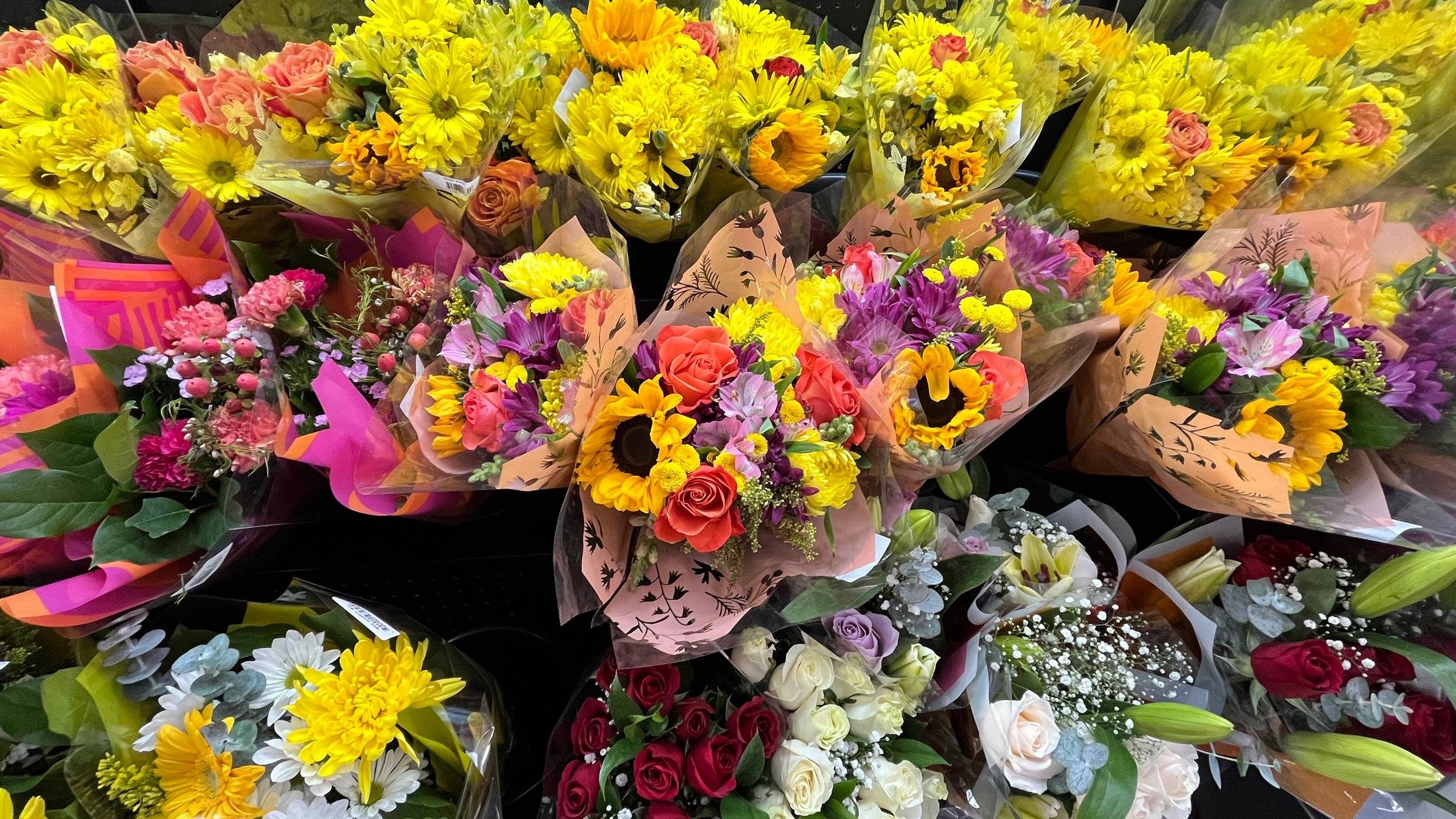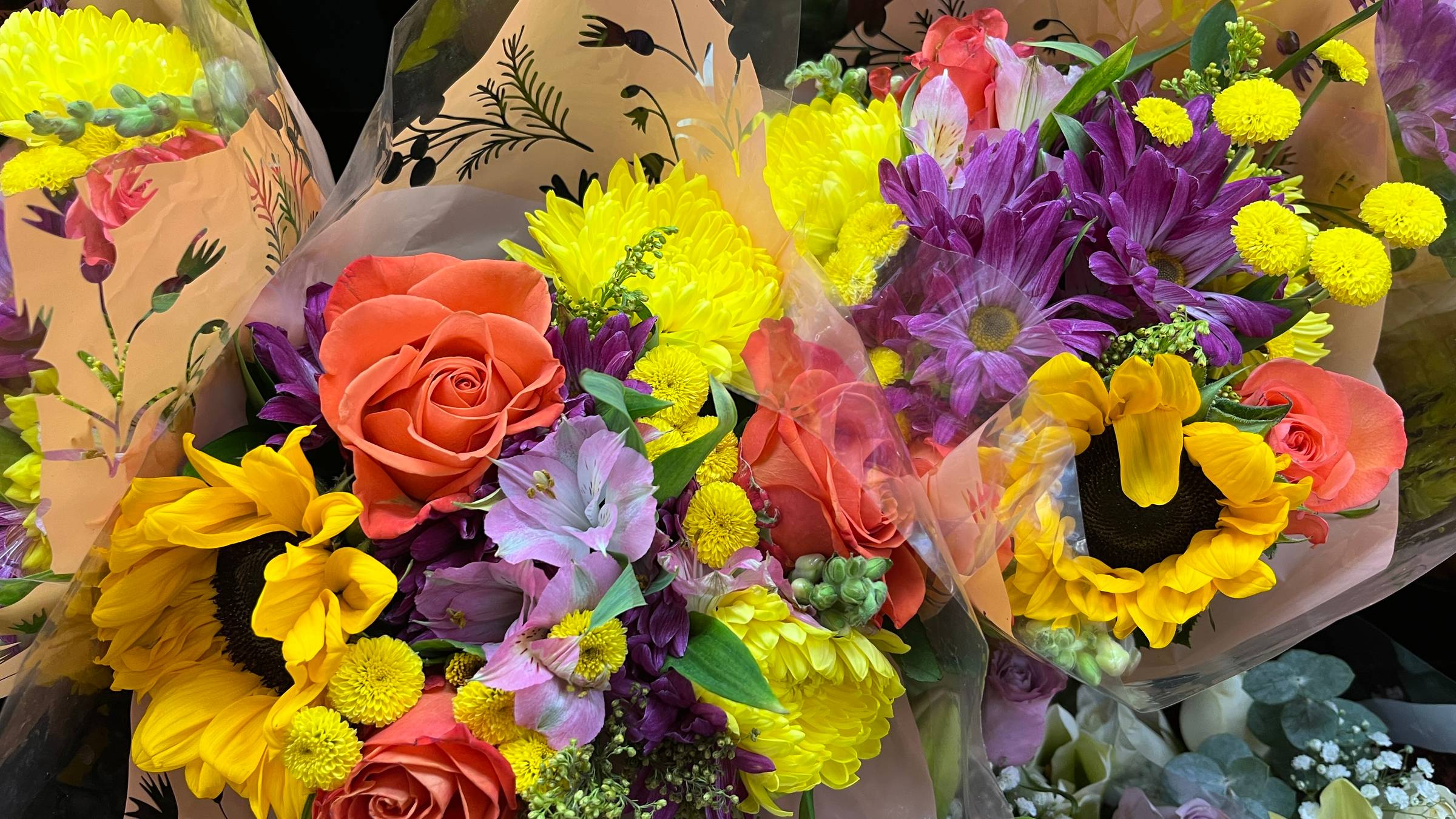 The bouquets right now include coral garden roses, which are lush and layered like tiny edible croissants made out of petals. There are bright sunflowers that look like little cheerful suns, which frankly feels unnecessary because the sky already provides that service for free. You’ll also see yellow chrysanthemums, including both fluffy cushion mums and those wild spidery ones that look like fireworks frozen mid-explosion.
